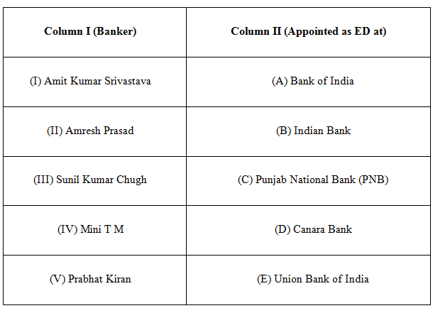 17) Match the following bankers (Column I) with their new appointments as Executive Director (ED) (Column II):