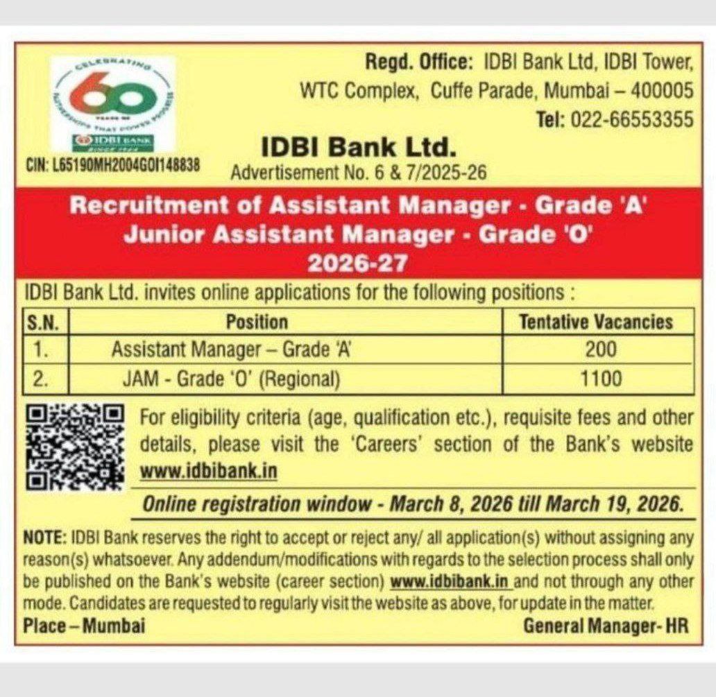 IDBI Assistant Manager Notification 2026 PDF: Short Notice Out, Recruitment Process, Eligibility, Apply Online