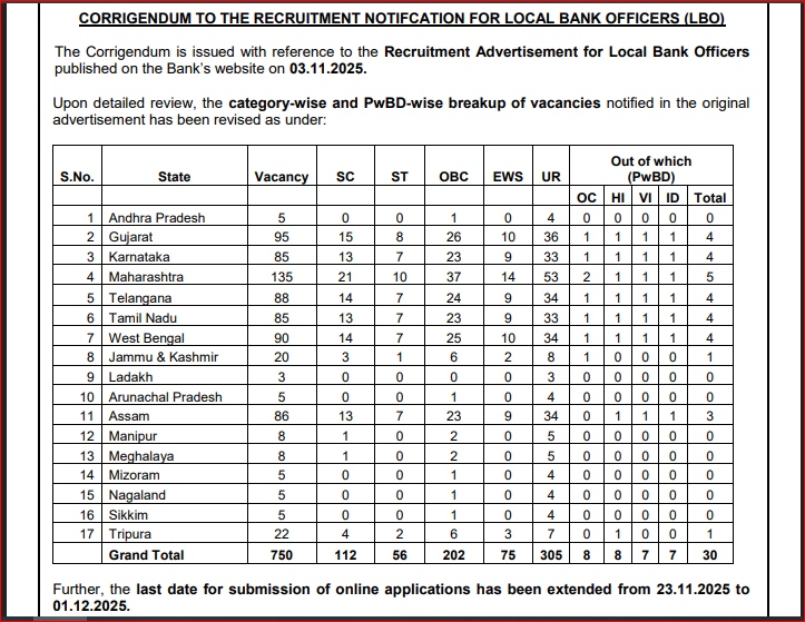 Punjab National Bank has released an official notification for PNB LBO Recruitment 2025. There are a total of 750 Local Bank Officer vacancies mentioned in the PNB LBO Notification 2025 PDF. The online application window is open from 3rd November 2025 to 1st December 2025. The Online Examination is expected to be held in December 2025 or January 2026. You can download the PNB LBO Notification PDF from this page. The PNB LBO apply online link is provided below. This page also includes details about the PNB LBO vacancy state wise, examination pattern, syllabus, exam dates, cut off marks, and more. For any questions, you can check the FAQs given below related to PNB LBO Recruitment.